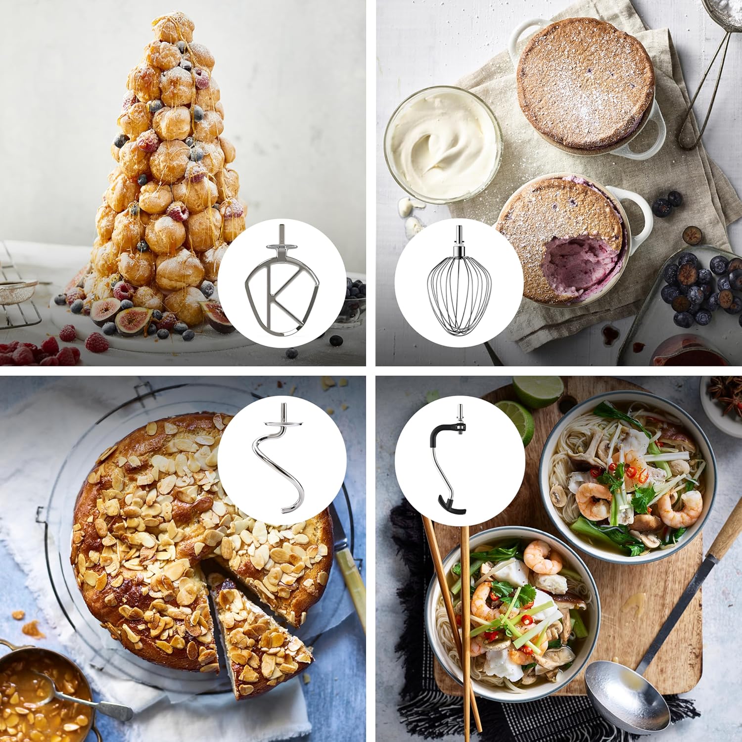 - ACCESORIATO: set di tre utensili da forno in acciaio inossidabile: frusta K, gancio impastatore, frusta, utensile per mescolare, tutti lavabili in lavastoviglie. Sono anche inclusi: cestello per la cottura a vapore, spatola e spalliera